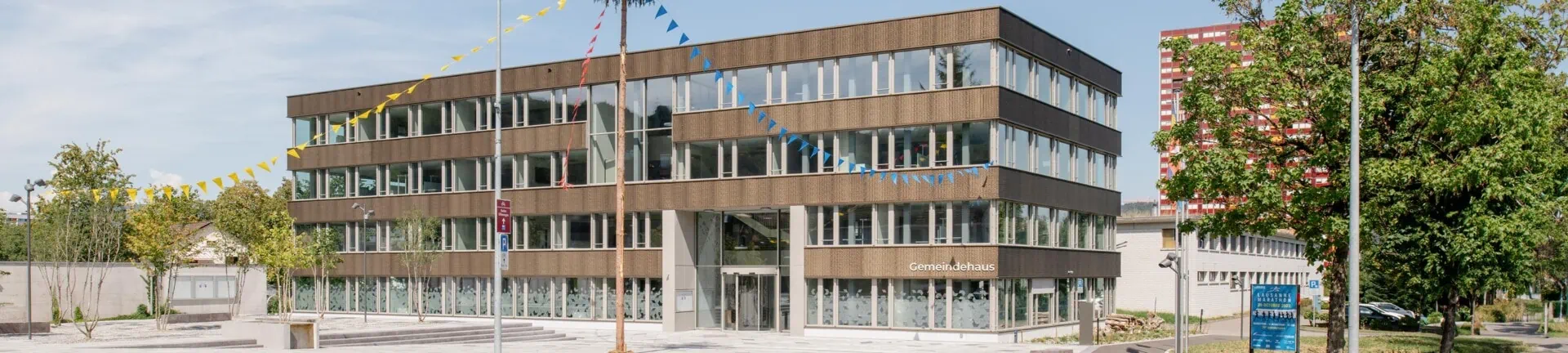 Zwischen Werkhof, Feuerwehr und Bauamt entstand in Spreitenbach das neue Gemeindehaus. Unter der Leitung der Gross Generalunternehmung ist ein modernes Gebäude entstanden, dass sich harmonisch in die Umgebung eingliedert und im Aussenbereich eine Begegnungsfläche für die Spreitenbacher Bevölkerung bietet.